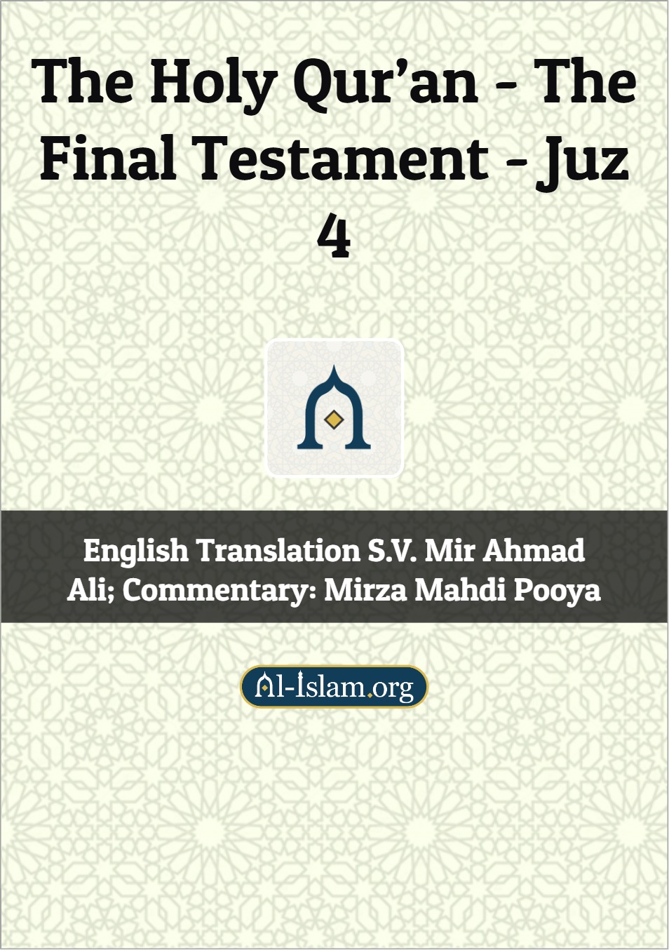 This text is the fourth volume of the translation and commentary of the Holy Qur’an by Mir Ahmad ‘Ali and Ayatullah Agha Hajj Mirza Mahdi Pooya Yazdi.